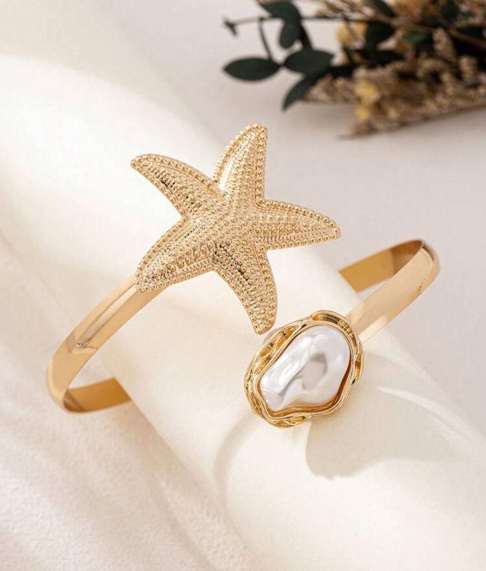Albida Love 1pc Fashionable Asymmetrical Pearl and Starfish Openwork Bracelet, B